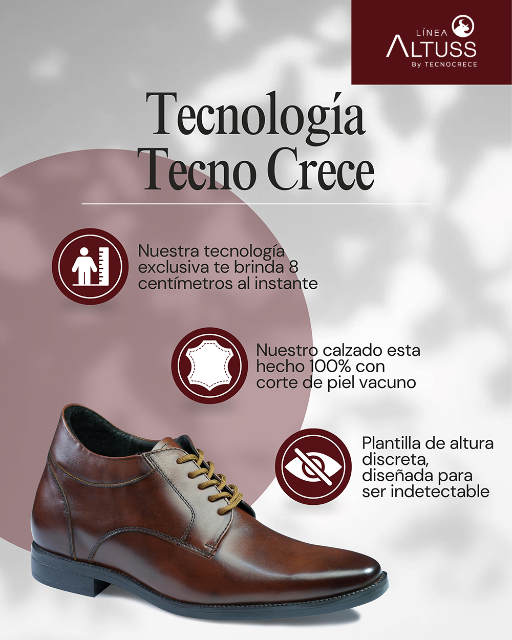 Nuestra pasión por el diseño, la tecnología y el confort nos llevó a desarrollar el sistema exclusivo Tecnocrece, una solución discreta y sofisticada que eleva tu estatura mientras mantiene la estética y la comodidad de un zapato tradicional.